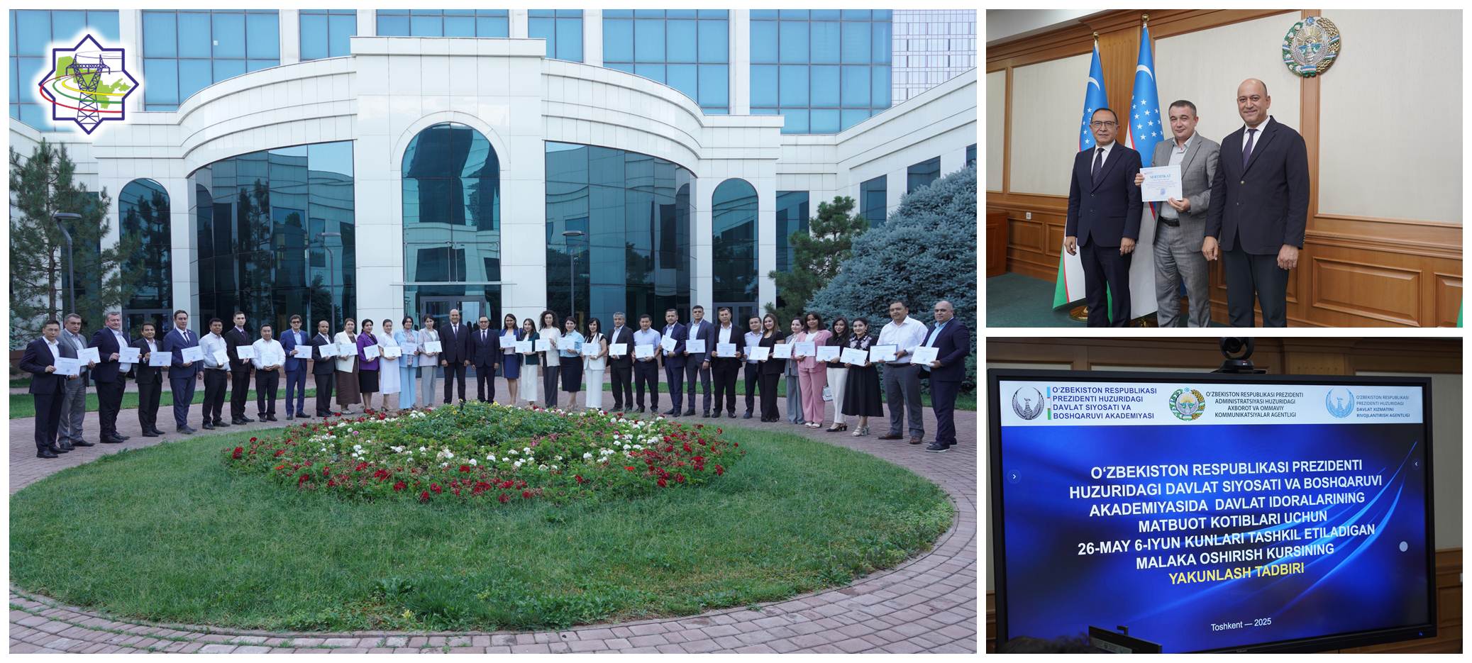 ✅ Bugun malaka oshirish kursini muvaffaqiyatli yakunlagan tinglovchi-matbuot kotiblariga Davlat siyosati va boshqaruvi akademiyasi sertifikati tantanali topshirildi.
