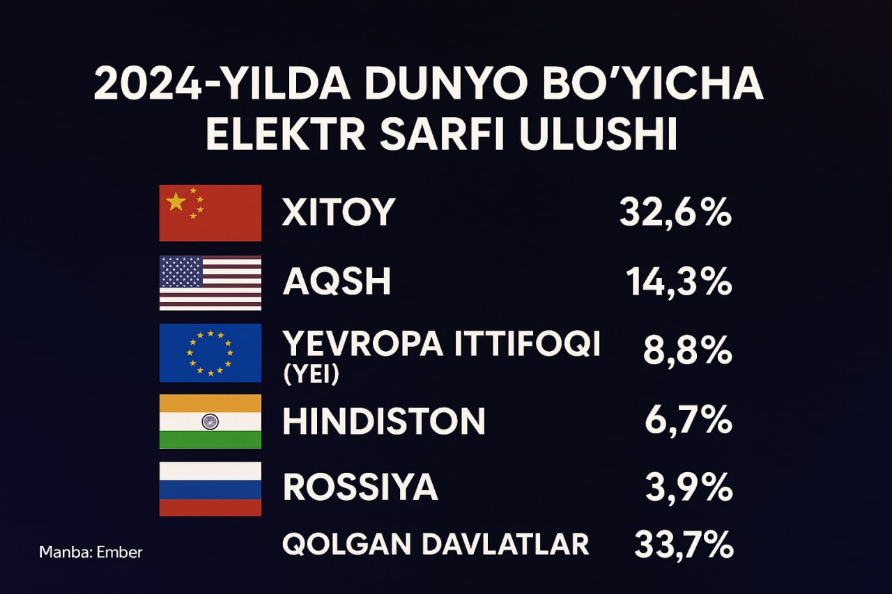 Jahon elektr energiyasi isteʼmolining deyarli uchdan bir qismi Xitoyga (32,6 foiz) toʻgʻri keldi. Bu koʻrsatkich boʻyicha u AQSHni (14,3 foiz) ikki barobardan ziyod farq bilan ortda qoldirdi. Yevropa Ittifoqi, Hindiston va Rossiyaning jami ulushi 19,4 foizni, qolgan barcha davlatlar ulushi esa 33,7 foizni tashkil qildi.