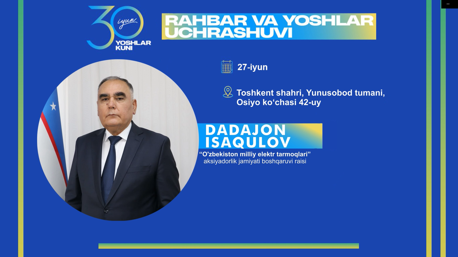 Ertaga, 2025-yil 27-iyun kuni soat 11:00 da "O‘zbekiston milliy elektr tarmoqlari" aksiyadorlik jamiyati boshqaruvi raisi Dadajon Aynaqulovich Isaqulov ishtirokida yoshlar bilan uchrashuv tadbiri o‘tkazilishi rejalashtirilmoqda.