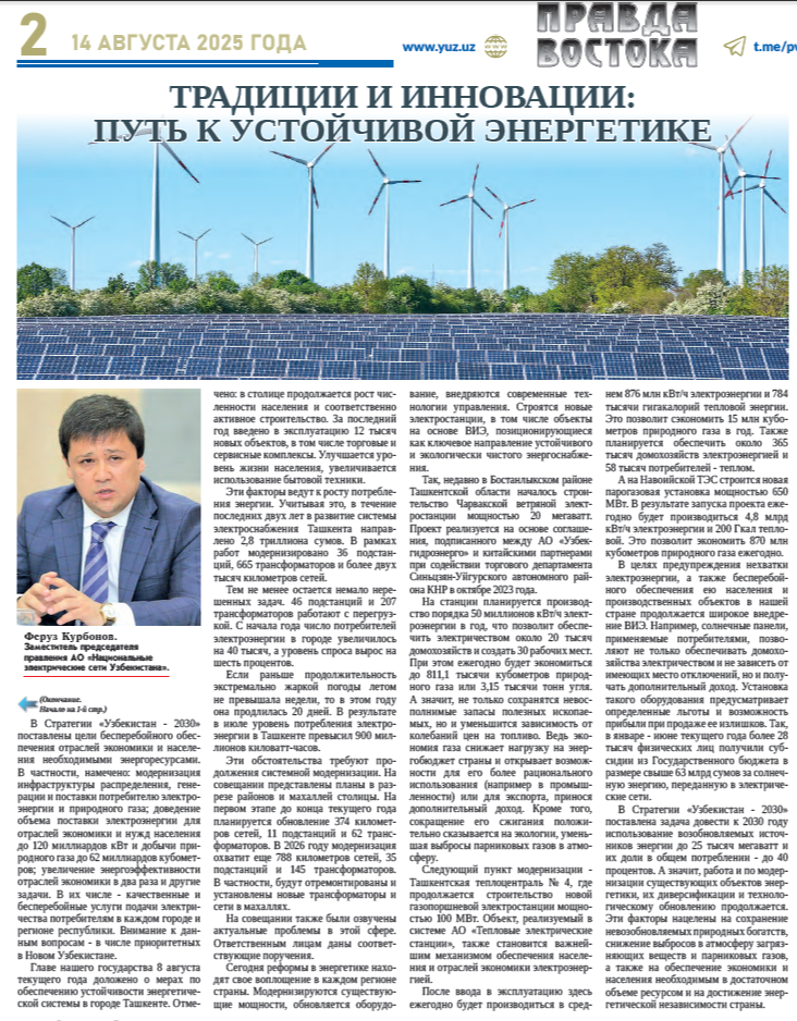 В Стратегии «Узбекистан - 2030» поставлена задача довести к 2030 году использование возобновляемых источников энергии до 25 тысяч мегаватт и доли в общем потреблении - до 40 процентов. А значит, работа и по модернизации существующих объектов энергетики, их диверсификации и технологическому обновлению продолжается. Эти факторы нацелены на сохранение невозобновляемых природных богатств, снижение выбросов в атмосферу загрязняющих веществ и парниковых газов, а также на обеспечение экономики и населения необходимым в достаточном объеме ресурсом и на достижение энергетической независимости страны.