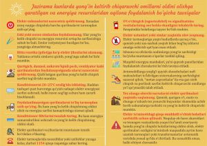 ➖ Электр ускуналарини назоратсиз қолдирманг. Хонадан узоқ вақтга чиқишда барча қурилмаларни тармоқдан узиб қўйинг. ➖ Эски ёки носоз симлардан фойдаланманг. Улар ёнғин келиб чиқиши ва энергия ресурсини ортиқча сарфланишига сабаб бўлади. Симлар изоляцияси бузилган бўлса, янгисига алмаштиринг.