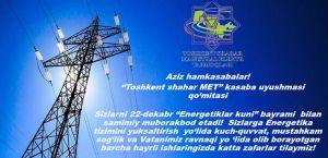 "Ўзбекистон миллий электр тармоқлари" акциядорлик жамияти "Тошкент шаҳар магистрал электр тармоқлари" филиали жамоаси номидан энергетика соҳасида фидокорона меҳнат қилиб келаётган барча соҳа вакиллари касб байрами- Энергетиклар куни билан чин дилдан муборакбод этамиз.