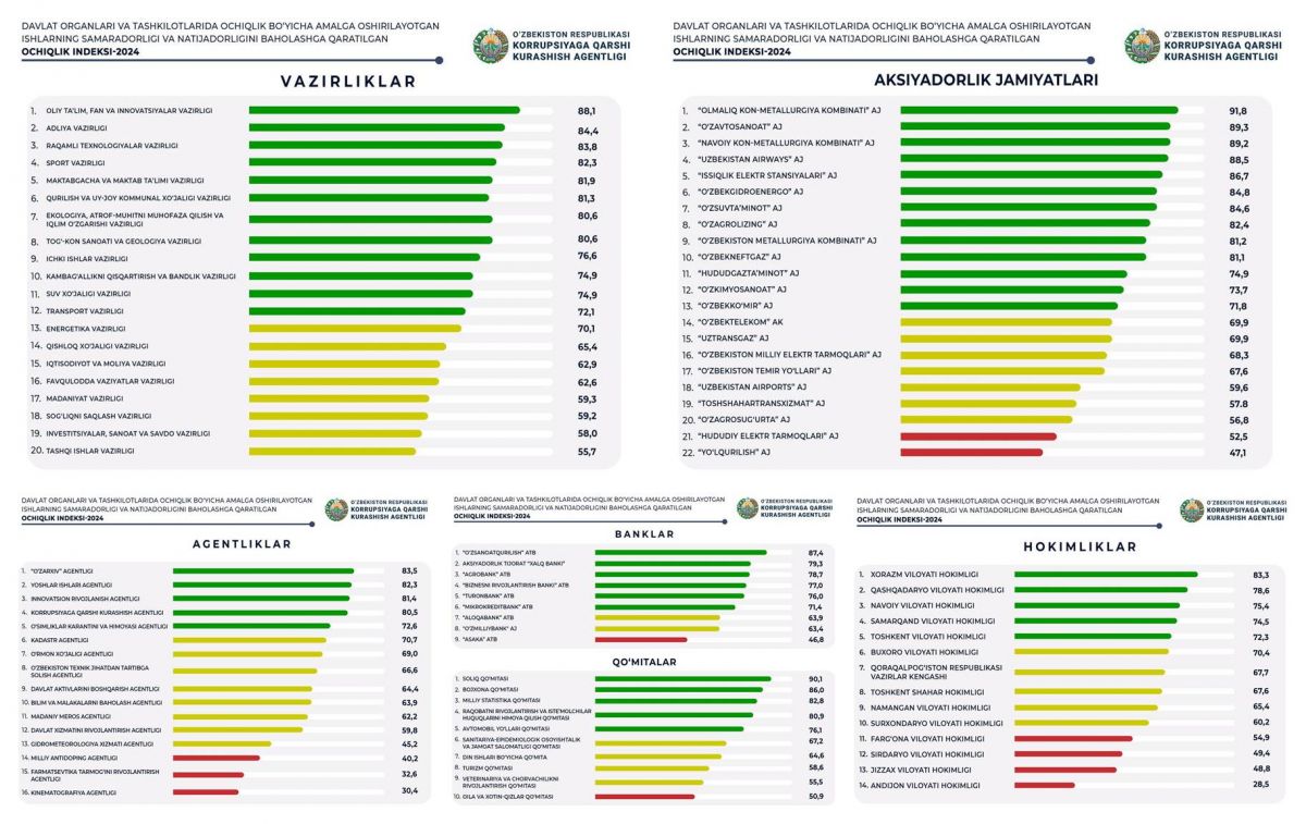 Маълумот ўрнида: Индекс 84 та баҳолаш мезонидан таркиб топган 8 та индикатор асосида шакллантирилиб келинмоқда. Бу йилги баҳолашда жами 98 та та республика ижро этувчи ҳокимият органлари – вазирлик, қўмита, агентлик, инспекциялар ва маҳаллий давлат ҳокимияти органлари фаолияти қамраб олинди.