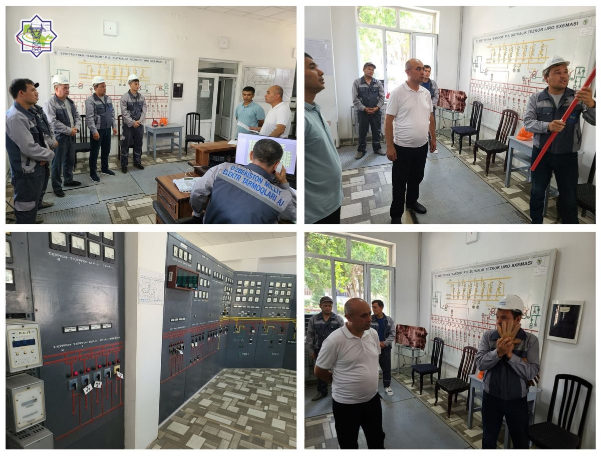 «Наманган магистрал электр тармоқлари" филиали таркибидаги 220/110/10 кВ кучланишли "Сардор" подстанцияси навбатчи ходимлари: Шарофиддин Ортиқов ва Равшанбек Собиржоновлар — Филиал бош муҳандиси томонидан тасдиқланган дастурга асосан, “Миллий диспетчерлик маркази” ДУК “ШМДБ” диспетчери А. Маматохунов назоратида, шартли “Л-Жанубий-110 кВ электр узатиш ҳаво тармоғида юзага келган авария натижасида ячейка Л-Жанубий-110 кВ ЭВ ўчмай қолди” ҳолат-мавзусида аварияга қарши амалий машғулот ўтказишди.