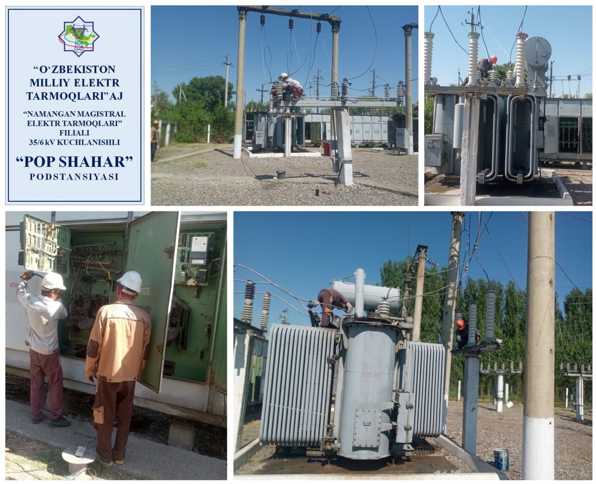 Аввал хабар берганимиздек "Наманган магистрал электр тармоқлари" филиали бош муҳандиси томонидан тасдиқланган йиллик режага асосан 35/6 кВ кучланишли "Поп шаҳар" подстанциясида Т-2 6 кВ 2-шиналар тизимида жорий таъмирлаш ишлари амалга оширилди.