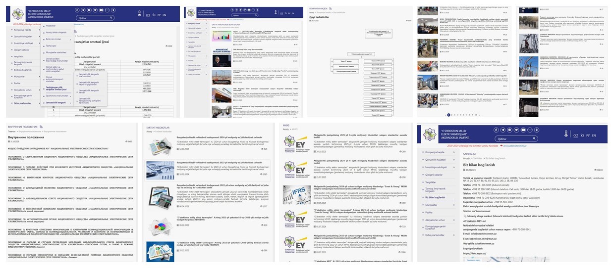 ✍️ 2025 йил 30 июль санасида Акциядорлик жамияти бошқаруви раиси томонидан имзоланган 150-сон буйруққа асосан Очиқ маълумотлар портали ҳамда расмий веб-сайт саҳифаларига Ўзбекистон Республикаси Президентининг 2021 йил 16 июндаги “Давлат органлари ва ташкилотларининг фаолияти очиқлигини таъминлаш, шунингдек, жамоатчилик назоратини самарали амалга оширишга доир қўшимча чора-тадбирлар тўғрисида”ги ПФ-6247-сонли Фармонида белгилаб берилган тартибдаги кенгайтирилган маълумотлар (иловага мувофиқ 20 та бандда белгилаб берилган) юкланиб, ҳисоботлар ўз вақтида тақдим этилмоқда.