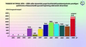 TAQQOS VA TAHLIL: 2014–2024-yillar davomida yuqori kuchlanishli podstansiyalarda yaratilgan qo‘shimcha o‘tkazuvchanlik quvvati hajmining o‘sib borish dinamikasi (MVA — megavolt•amper hisobida, to‘la quvvat)