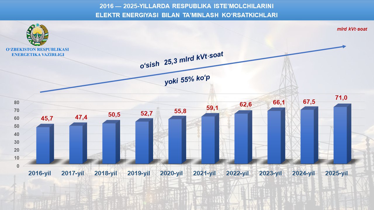 ⇒ 2025 йили истеъмолчиларга 2016 йилдагига нисбатан 25,3 млрд кВт⋅соат ёки 55 фоиз кўп электр энергияси етказиб берилди.