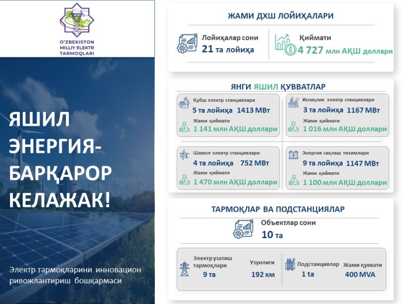 Шунингдек, ўтган йил сўнггида ДХШ лойиҳалари доирасида Энергетика тизимида жами 21 та 4.727 миллиард долларлик умумий қуввати 4 479 МВт (5 та ҚФЭС – 1413 МВт,