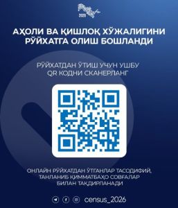 O‘zbekiston Respublikasi Prezidentining 2025-yil 19-sentyabrdagi “O‘zbekiston Respublikasida aholi va qishloq xo‘jaligini ro‘yxatga olish tadbirini o‘tkazish to‘g‘risida”gi PF-173 son farmoni bilan 2026-yil 15-yanvar — 28-fevral kunlari muhim tadbir o‘tkaziladi.