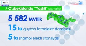Yurtimizda umumiy quvvati 5 582 MVt boʻlgan 15 ta quyosh fotoelektr stansiyasi hamda 5 ta shamol elektr stansiyasi “yashil” energiya ishlab chiqarmoqda.