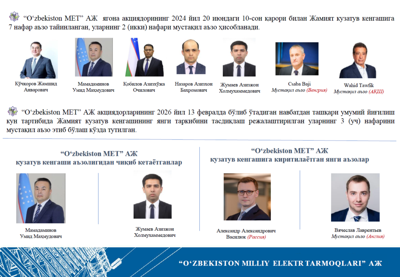 “O‘zbekiston MET” AJ Kuzatuv kengashi aʼzolari tarkibi to‘g‘risida