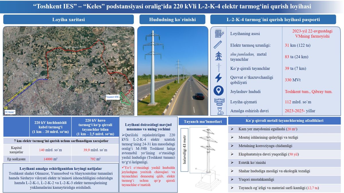 ⚡️ Ushbu loyiha doirasida loyihalanayotgan elektr tarmog‘ining Toshkent shahri hududidan o‘tuvchi qismida zamonaviy ko‘p qirrali metall tayanchlar o‘rnatirilishi rejalashtirilgan. Bundan tashqari, mazkur elektr tarmog‘ining Toshkent shahridan o‘tuvchi bir qismida 220 kV kuchlanishdagi kabel tarmog‘ini qurish ko‘zda tutilgan.