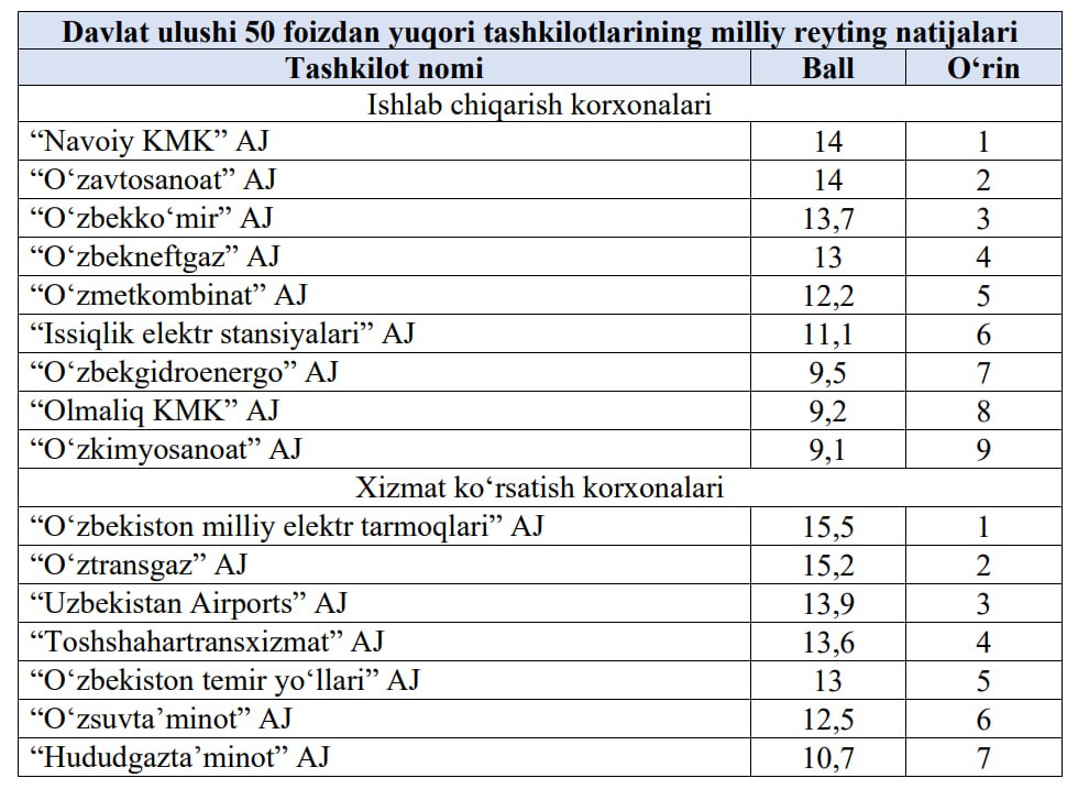 Кроме того, среди производственных предприятий в пятёрку лидеров вошли АО «Узбекнефтегаз» и АО «Тепловые электрические станции».