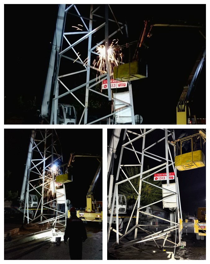 Юк автомобиль урилган металл конструкцияли таянч устуни тикланмоқда