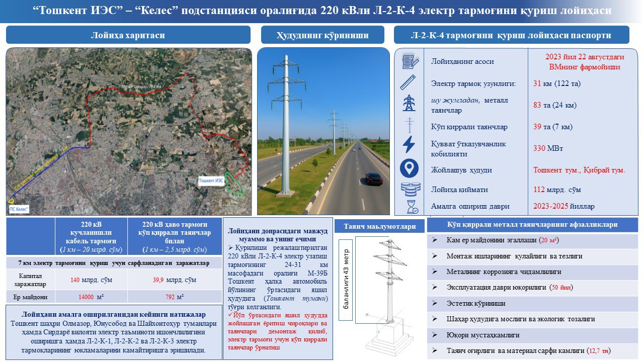Фармойишга асосан Тошкент ИЭС ва “Келес” подстанцияси оралиғида 220 кВ кучланишли узатиш электр тармоғининг тўртинчи занжирини, Л-2-К-4 электр тармоғини қуриш белгиланган бўлиб, ушбу лойиҳани амалга ошириш орқали Тошкент шаҳри Олмазор, Юнусобод ва Шайхонтоҳур туманлари ҳамда Сирдарё вилояти электр таъминоти ишончлилигини ошириш ҳамда мавжуд 220 кВли Л-2-К-1, Л-2-К-2 ва Л-2-К-3 электр тармоқларининг юкламаларини камайтиришга эришилади.